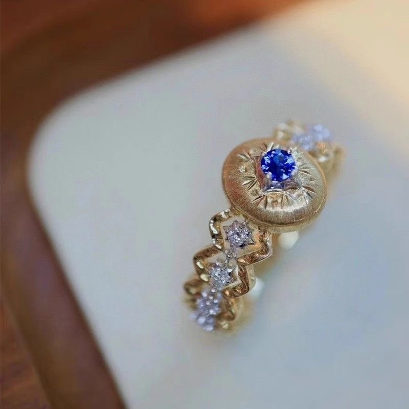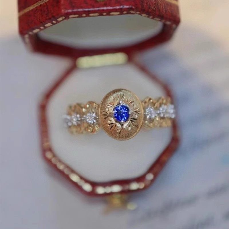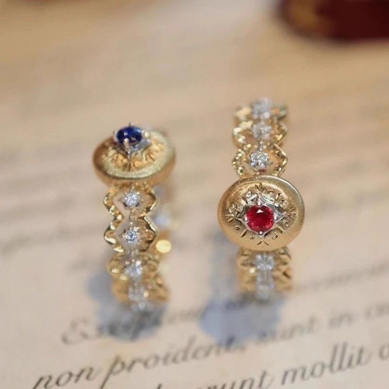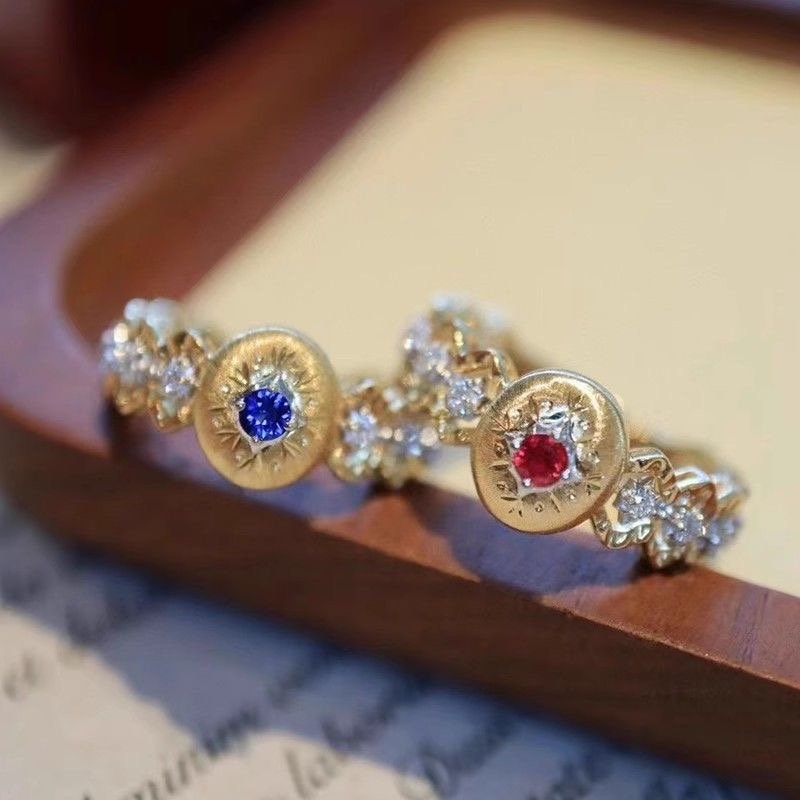 Carved gold openwork lace double-color gold diamond red corundum colorful ring quantity